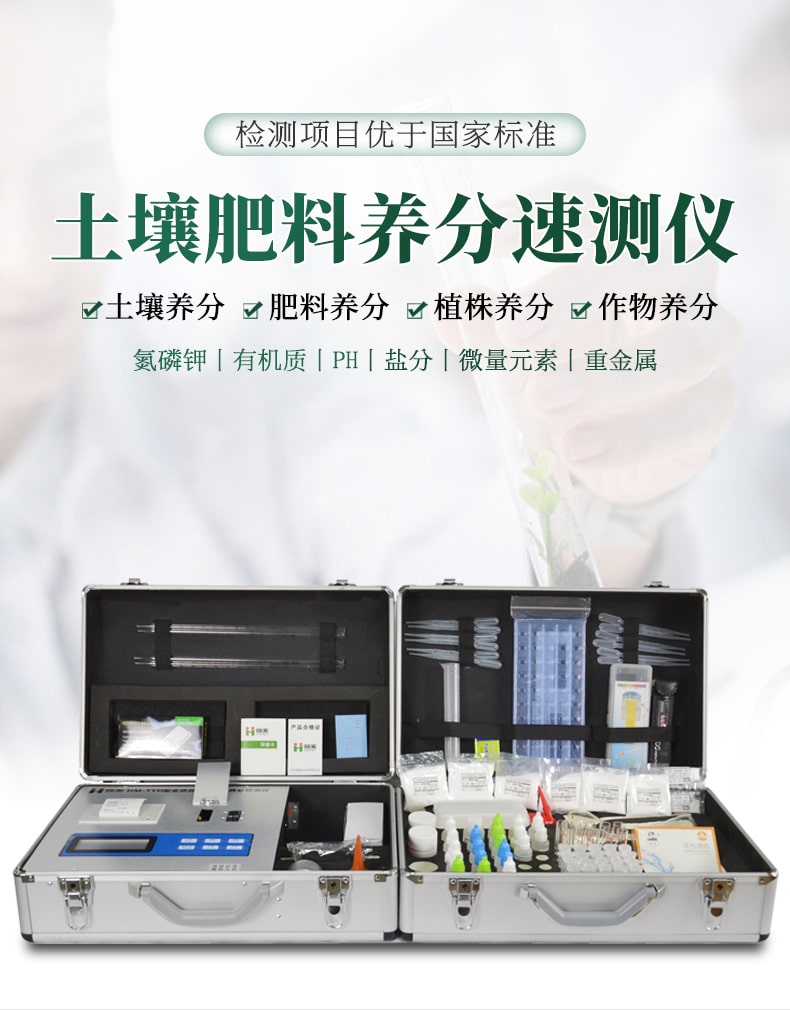 配套齐全:土壤养分速测仪该仪器集药、器、仪为一体,携带方便,相当于一个小型实验室。适于农业服务部门或农资经销商、肥料厂商测土施肥和鉴别肥料真假。